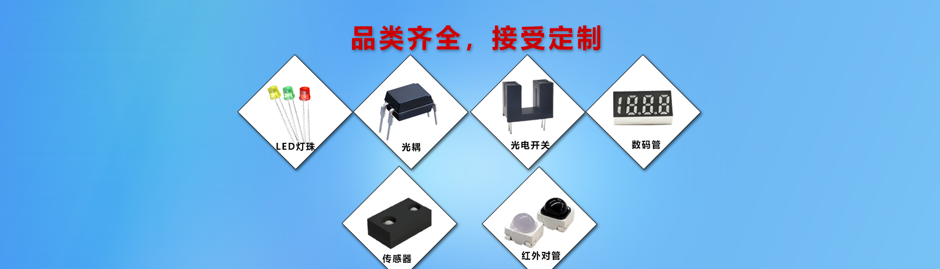 主營LED燈珠、數碼管、光耦、光電開關、紅外對管等產品